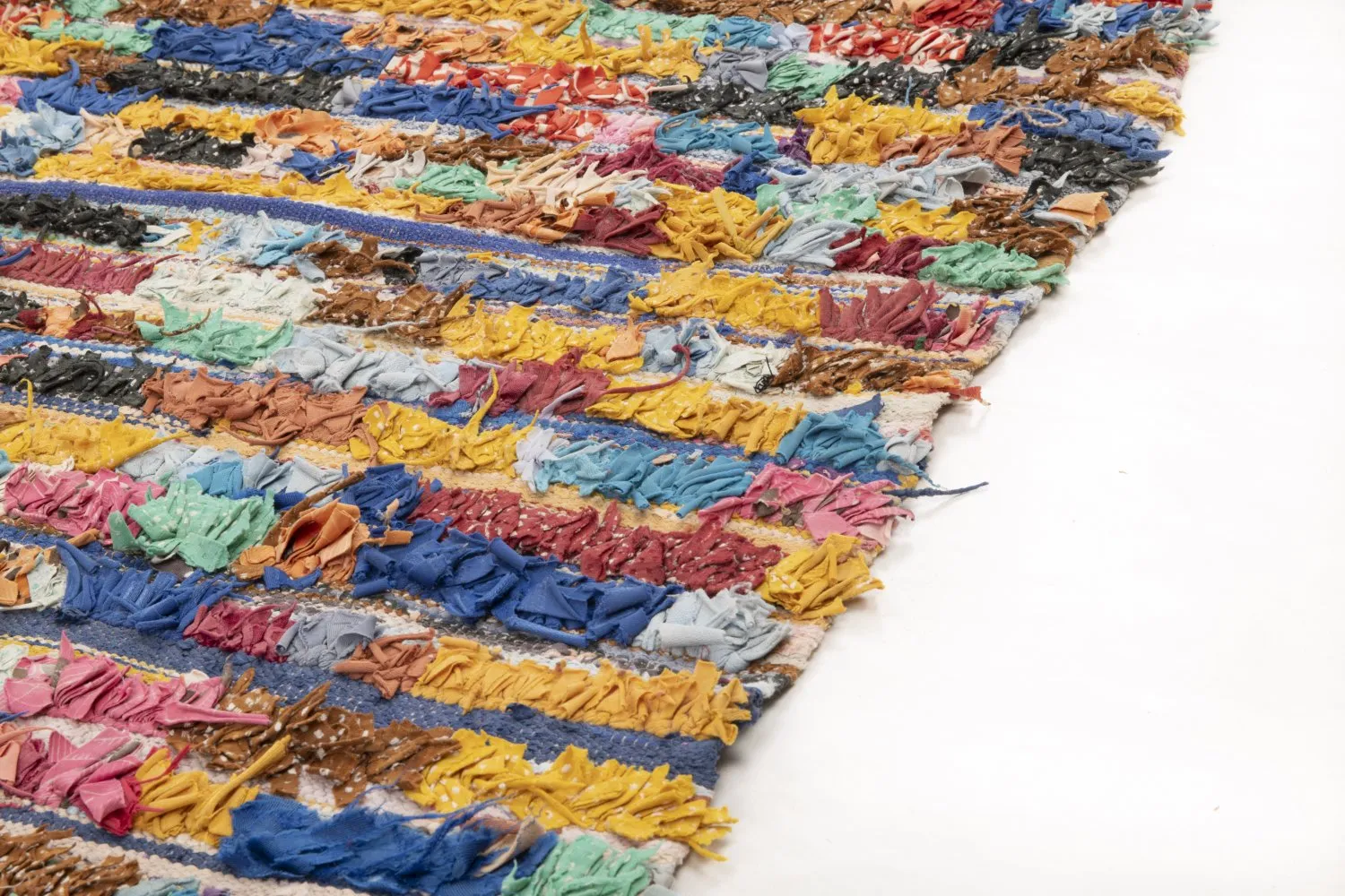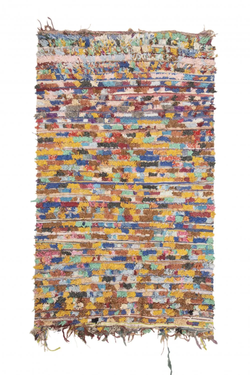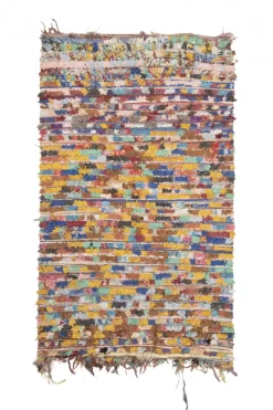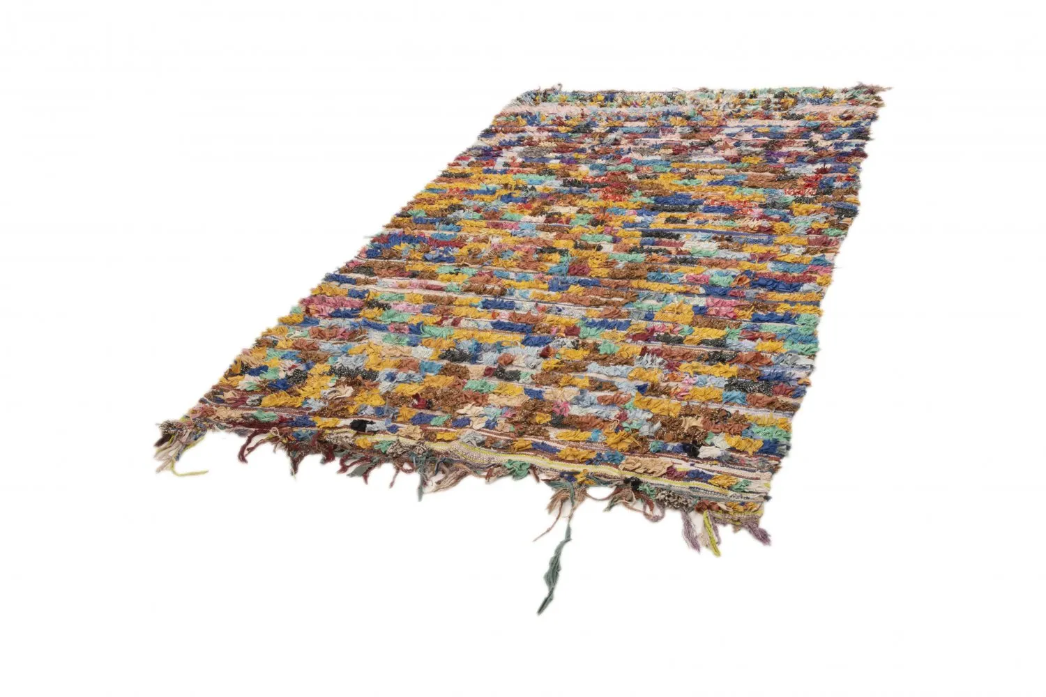 Der Boucherouite-Teppich reiht sich in die fantastischen Teppichkreationen ein, die aus Marokko kommen. Als Flickenteppich wird er aus gebrauchten Textilien wie Wolle, Garn, Kunstfasern und anderen Textilmaterialien hergestellt, die wiederverwertet werden können. Dieser wunderschöne marokkanische Flickenteppich ist das Ergebnis der Veränderungen, die in den letzten Jahren in Marokko auf dem Land stattgefunden haben, wo die herkömmlich nomadische Kultur fester Landwirtschaft und anderen Formen des Broterwerbs gewichen ist. Hierdurch ist die kostbare Schurwolle, das Material der Beni-Ourain- und Azilal-Teppiche, noch seltener geworden. Deswegen ist es umso wichtiger, gebrauchte Textilien wiederzuverwerten. Die marokkanischen Frauen auf dem Land haben hierin unvergleichliche Fähigkeiten entwickelt. Die Farben und das Muster des Boucherouite-Teppichs kennen wir bereits vom Azilal-Teppich. Beide Teppiche sind auf Kunstausstellungen weltweit zu sehen.