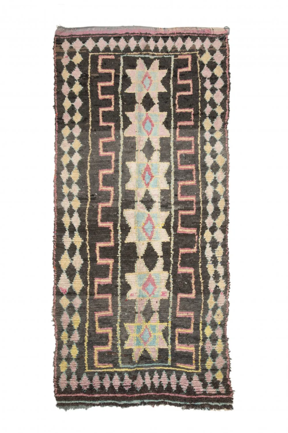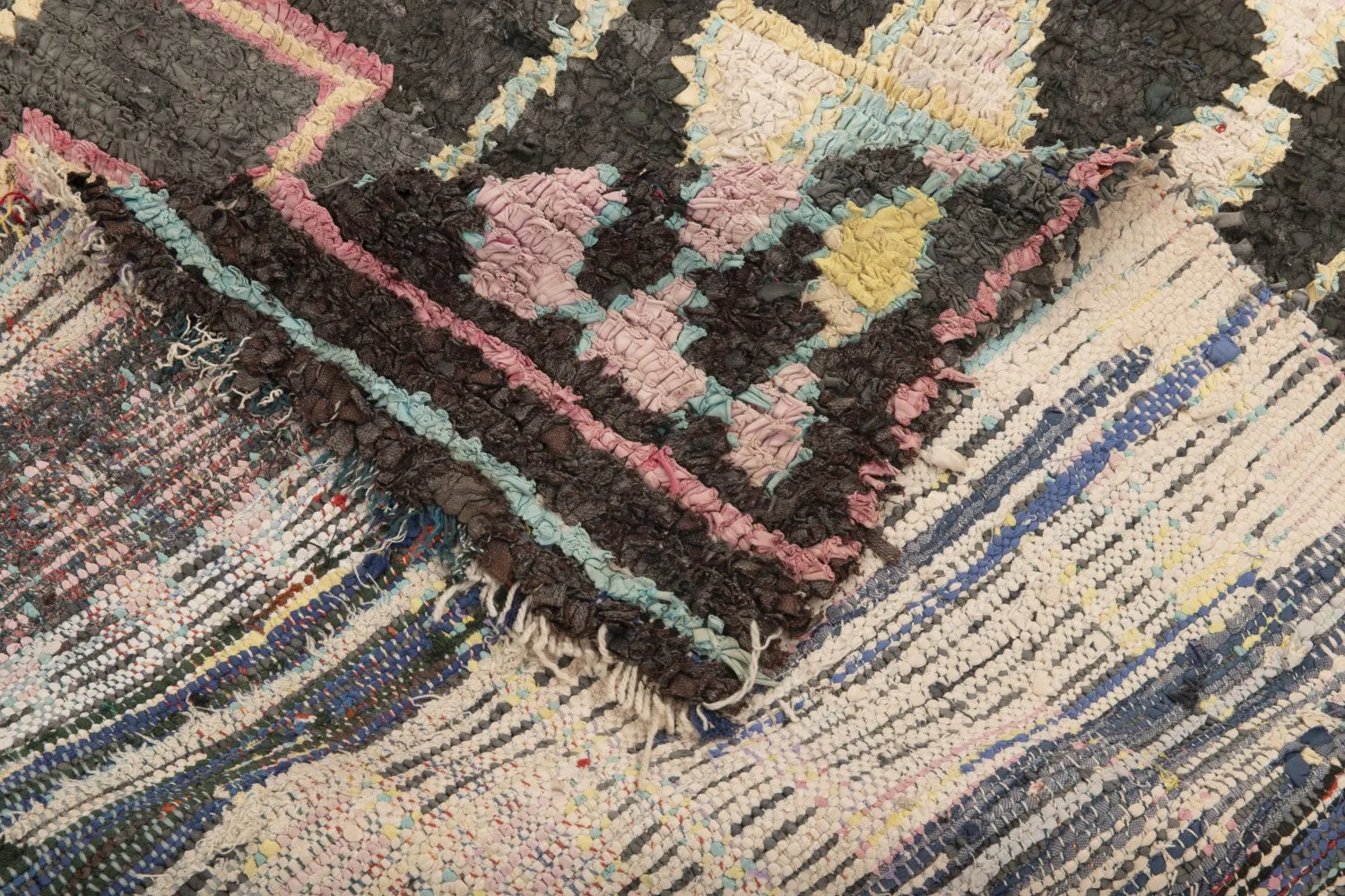 Der Boucherouite-Teppich reiht sich in die fantastischen Teppichkreationen ein, die aus Marokko kommen. Als Flickenteppich wird er aus gebrauchten Textilien wie Wolle, Garn, Kunstfasern und anderen Textilmaterialien hergestellt, die wiederverwertet werden können. Dieser wunderschöne marokkanische Flickenteppich ist das Ergebnis der Veränderungen, die in den letzten Jahren in Marokko auf dem Land stattgefunden haben, wo die herkömmlich nomadische Kultur fester Landwirtschaft und anderen Formen des Broterwerbs gewichen ist. Hierdurch ist die kostbare Schurwolle, das Material der Beni-Ourain- und Azilal-Teppiche, noch seltener geworden. Deswegen ist es umso wichtiger, gebrauchte Textilien wiederzuverwerten. Die marokkanischen Frauen auf dem Land haben hierin unvergleichliche Fähigkeiten entwickelt. Die Farben und das Muster des Boucherouite-Teppichs kennen wir bereits vom Azilal-Teppich. Beide Teppiche sind auf Kunstausstellungen weltweit zu sehen.
