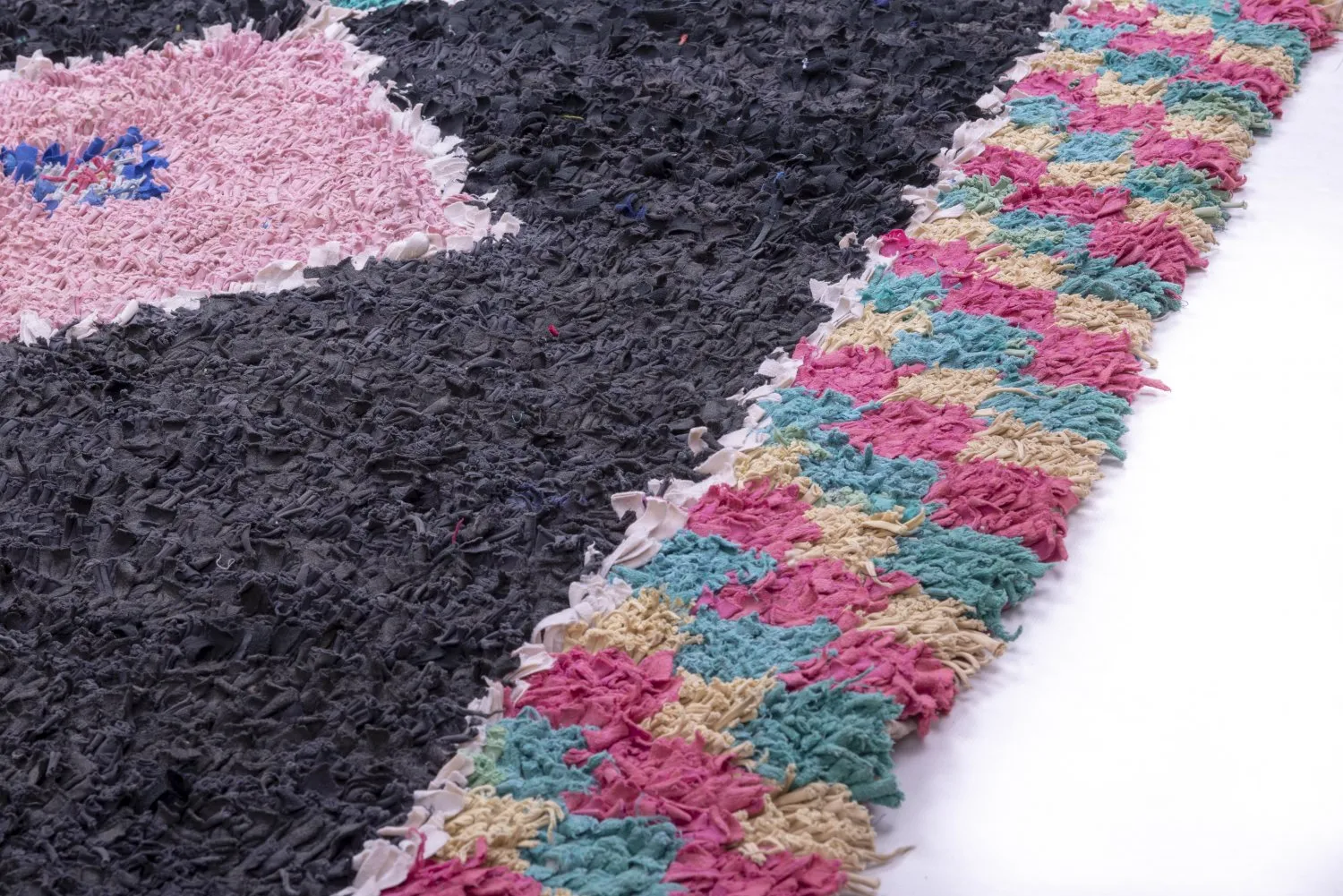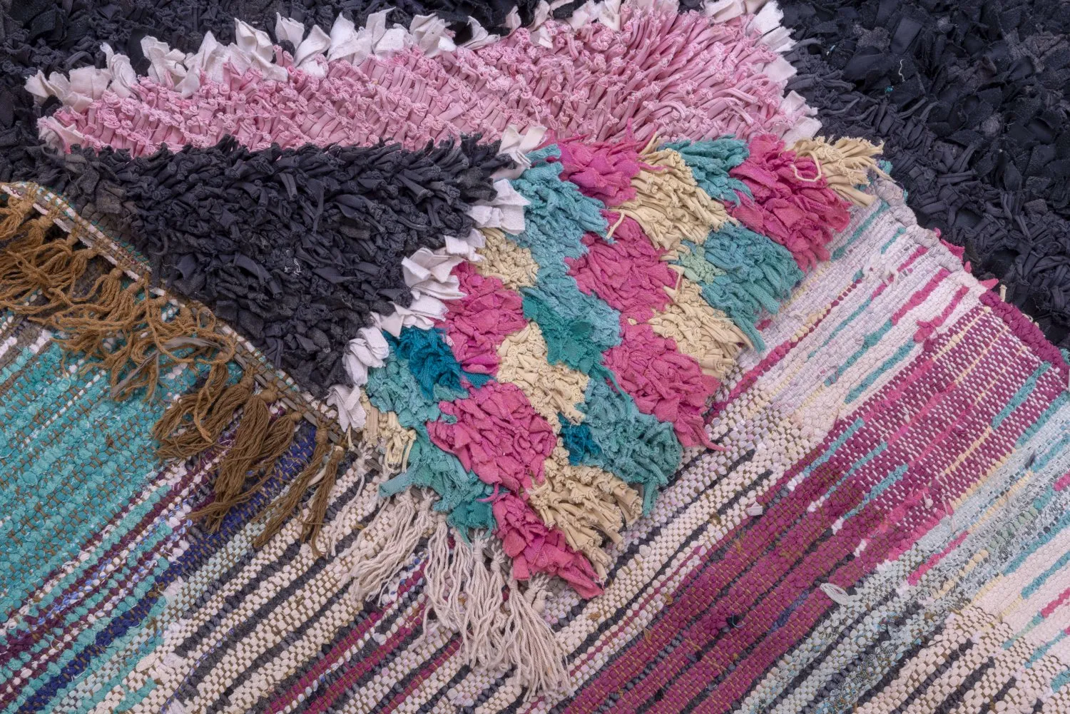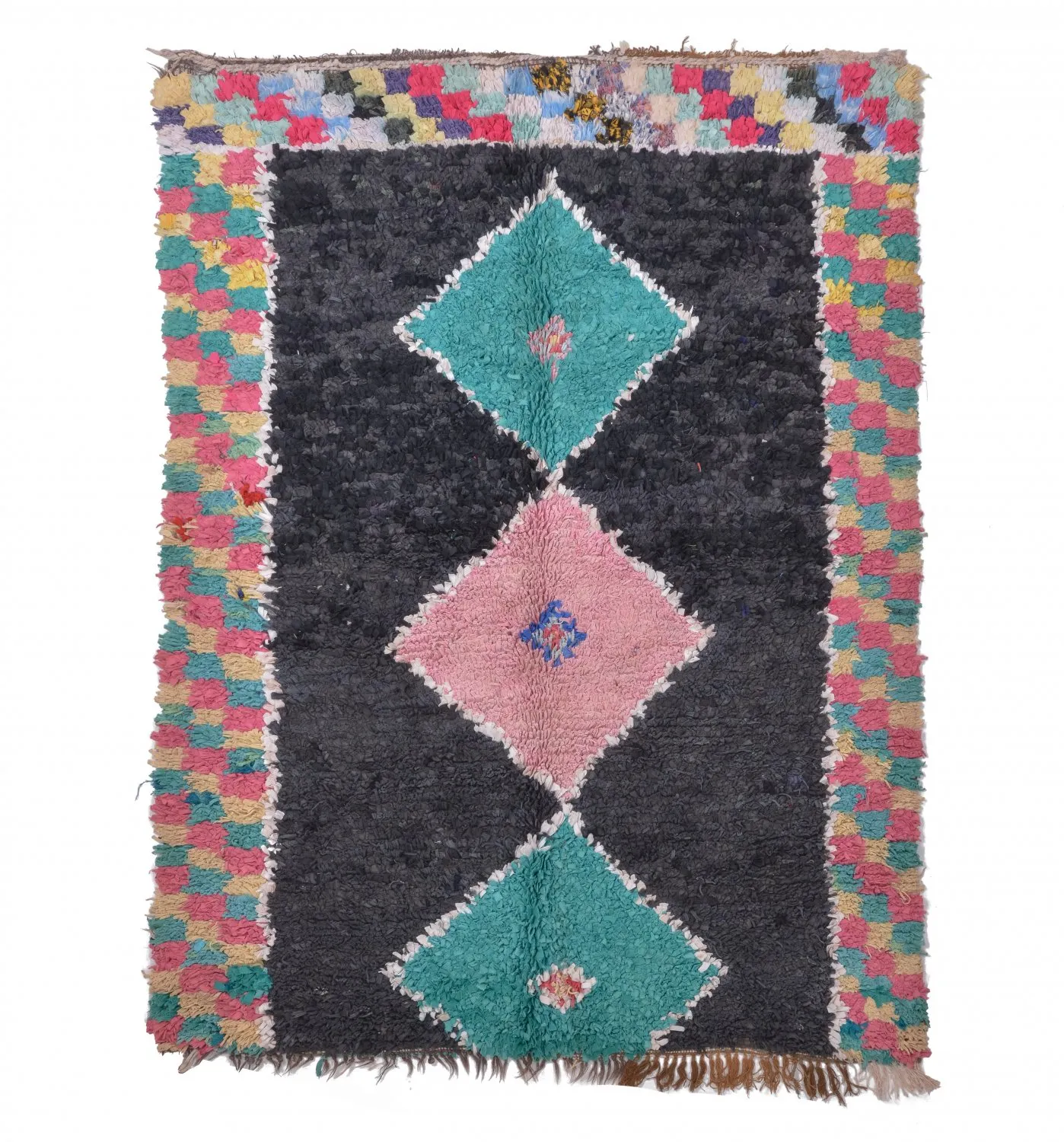 Der Boucherouite-Teppich reiht sich in die fantastischen Teppichkreationen ein, die aus Marokko kommen. Als Flickenteppich wird er aus gebrauchten Textilien wie Wolle, Garn, Kunstfasern und anderen Textilmaterialien hergestellt, die wiederverwertet werden können. Dieser wunderschöne marokkanische Flickenteppich ist das Ergebnis der Veränderungen, die in den letzten Jahren in Marokko auf dem Land stattgefunden haben, wo die herkömmlich nomadische Kultur fester Landwirtschaft und anderen Formen des Broterwerbs gewichen ist. Hierdurch ist die kostbare Schurwolle, das Material der Beni-Ourain- und Azilal-Teppiche, noch seltener geworden. Deswegen ist es umso wichtiger, gebrauchte Textilien wiederzuverwerten. Die marokkanischen Frauen auf dem Land haben hierin unvergleichliche Fähigkeiten entwickelt. Die Farben und das Muster des Boucherouite-Teppichs kennen wir bereits vom Azilal-Teppich. Beide Teppiche sind auf Kunstausstellungen weltweit zu sehen.