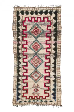 Der Boucherouite-Teppich reiht sich in die fantastischen Teppichkreationen ein, die aus Marokko kommen. Als Flickenteppich wird er aus gebrauchten Textilien wie Wolle, Garn, Kunstfasern und anderen Textilmaterialien hergestellt, die wiederverwertet werden können. Dieser wunderschöne marokkanische Flickenteppich ist das Ergebnis der Veränderungen, die in den letzten Jahren in Marokko auf dem Land stattgefunden haben, wo die herkömmlich nomadische Kultur fester Landwirtschaft und anderen Formen des Broterwerbs gewichen ist. Hierdurch ist die kostbare Schurwolle, das Material der Beni-Ourain- und Azilal-Teppiche, noch seltener geworden. Deswegen ist es umso wichtiger, gebrauchte Textilien wiederzuverwerten. Die marokkanischen Frauen auf dem Land haben hierin unvergleichliche Fähigkeiten entwickelt. Die Farben und das Muster des Boucherouite-Teppichs kennen wir bereits vom Azilal-Teppich. Beide Teppiche sind auf Kunstausstellungen weltweit zu sehen.