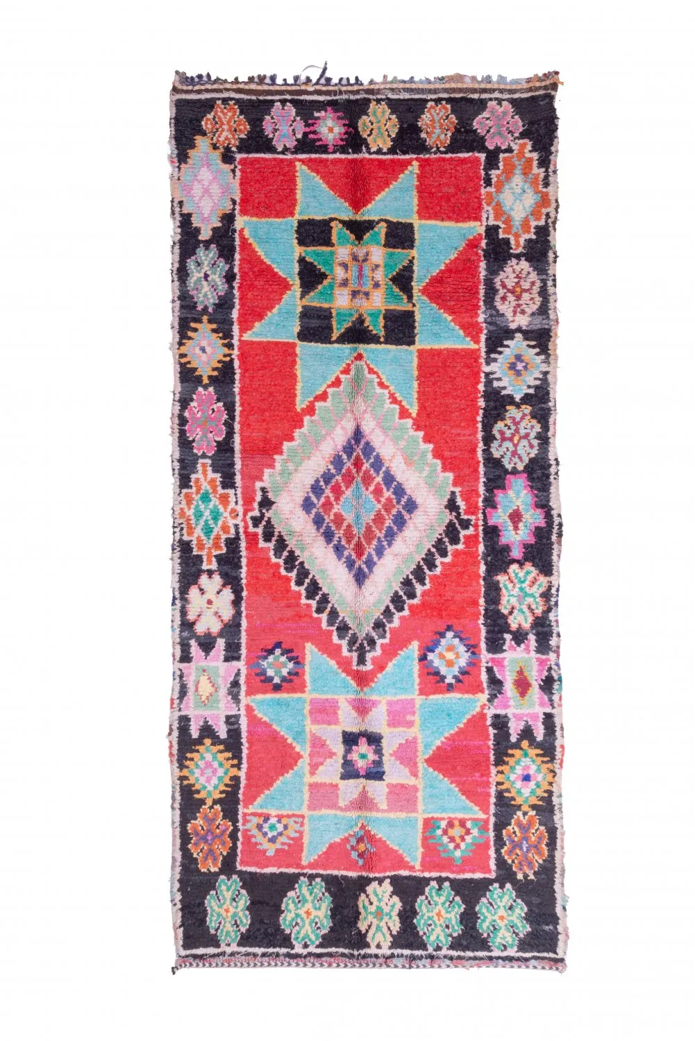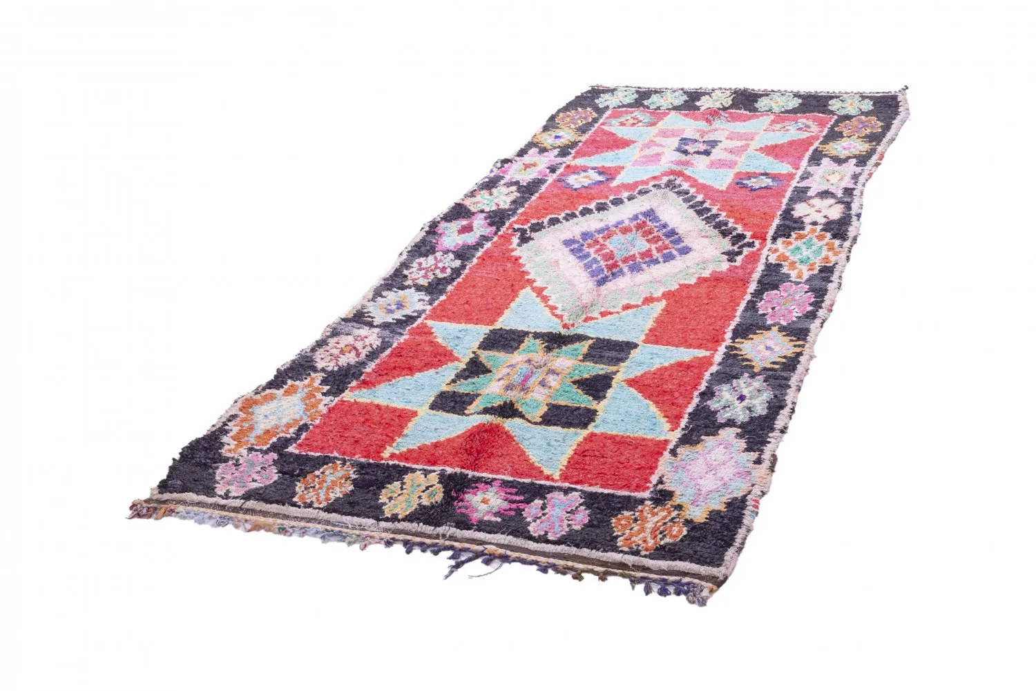 Der Boucherouite-Teppich reiht sich in die fantastischen Teppichkreationen ein, die aus Marokko kommen. Als Flickenteppich wird er aus gebrauchten Textilien wie Wolle, Garn, Kunstfasern und anderen Textilmaterialien hergestellt, die wiederverwertet werden können. Dieser wunderschöne marokkanische Flickenteppich ist das Ergebnis der Veränderungen, die in den letzten Jahren in Marokko auf dem Land stattgefunden haben, wo die herkömmlich nomadische Kultur fester Landwirtschaft und anderen Formen des Broterwerbs gewichen ist. Hierdurch ist die kostbare Schurwolle, das Material der Beni-Ourain- und Azilal-Teppiche, noch seltener geworden. Deswegen ist es umso wichtiger, gebrauchte Textilien wiederzuverwerten. Die marokkanischen Frauen auf dem Land haben hierin unvergleichliche Fähigkeiten entwickelt. Die Farben und das Muster des Boucherouite-Teppichs kennen wir bereits vom Azilal-Teppich. Beide Teppiche sind auf Kunstausstellungen weltweit zu sehen.