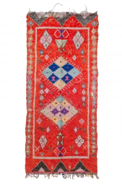 Der Boucherouite-Teppich reiht sich in die fantastischen Teppichkreationen ein, die aus Marokko kommen. Als Flickenteppich wird er aus gebrauchten Textilien wie Wolle, Garn, Kunstfasern und anderen Textilmaterialien hergestellt, die wiederverwertet werden können. Dieser wunderschöne marokkanische Flickenteppich ist das Ergebnis der Veränderungen, die in den letzten Jahren in Marokko auf dem Land stattgefunden haben, wo die herkömmlich nomadische Kultur fester Landwirtschaft und anderen Formen des Broterwerbs gewichen ist. Hierdurch ist die kostbare Schurwolle, das Material der Beni-Ourain- und Azilal-Teppiche, noch seltener geworden. Deswegen ist es umso wichtiger, gebrauchte Textilien wiederzuverwerten. Die marokkanischen Frauen auf dem Land haben hierin unvergleichliche Fähigkeiten entwickelt. Die Farben und das Muster des Boucherouite-Teppichs kennen wir bereits vom Azilal-Teppich. Beide Teppiche sind auf Kunstausstellungen weltweit zu sehen.