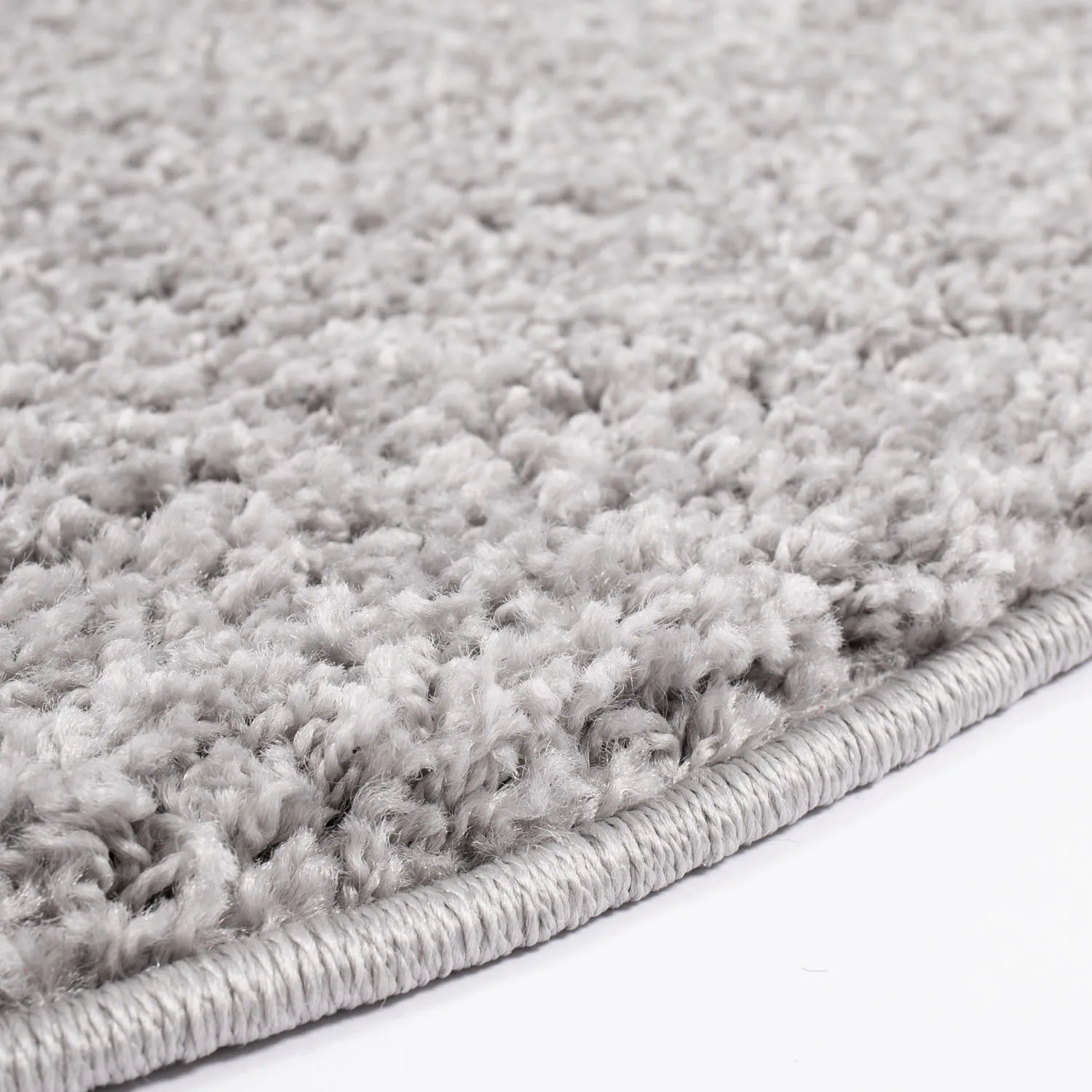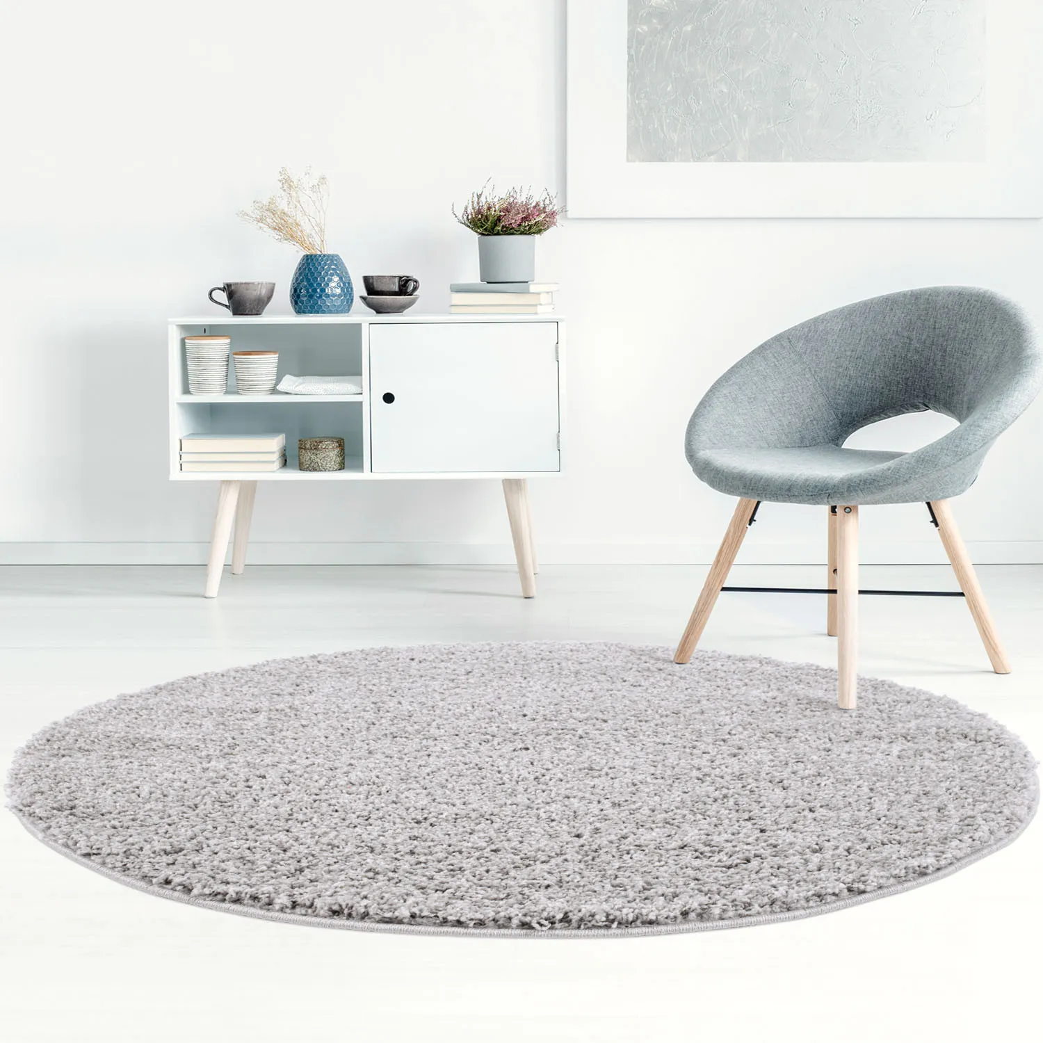 Der Hochflorteppich Trim mit kurzem und dichtem Flor, hier in runder Form. Glänzende Fäden werden mit monochromen Fäden verwebt, wodurch ein lebhafter und fließender zotteliger Teppich entsteht. Lassen Sie Ihre Füße weich und bequem landen, wenn Sie auf diesem gemütlichen Hochflorteppich herumlaufen. Der Teppich passt genauso gut unter den Küchentisch wie als Wohnzimmer- oder Kinderteppich. Hier sehen Sie den Teppich in der Farbe Grau.